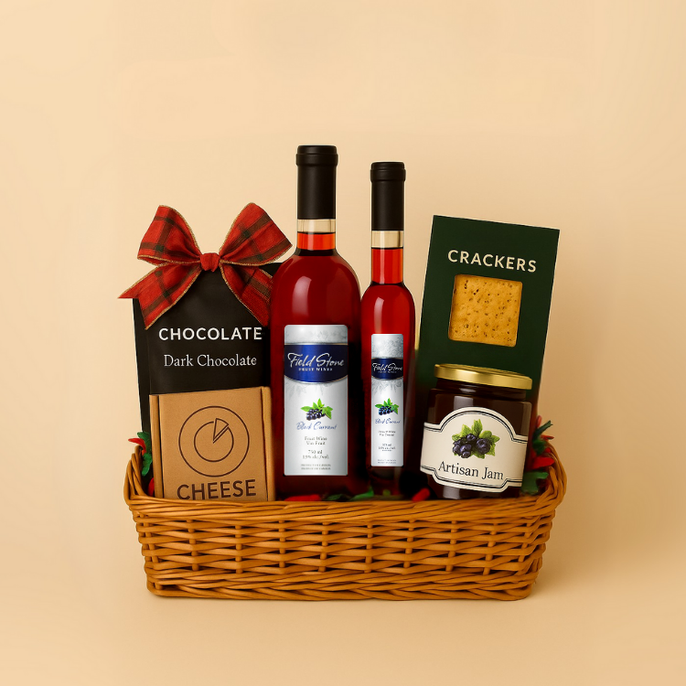 Relish the season with the Savoury Holiday Gift Basket, featuring all local favourites. Enjoy Black Currant Fruit Wine and Black Currant Dessert Wine alongside artisan cheese, crackers, and jam for a savoury-forward tasting experience. A handy recipe card links to our holiday recipe eBook for simple, crowd-pleasing pairings.